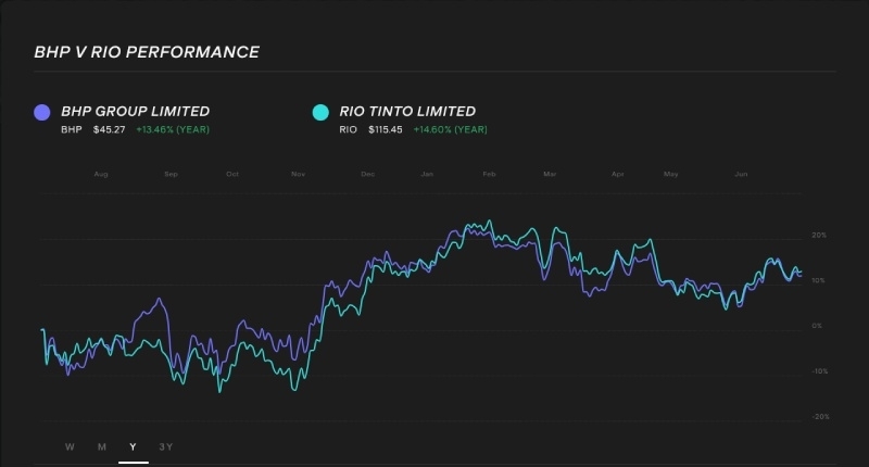 $BHP and $RIO 1-year performance compared