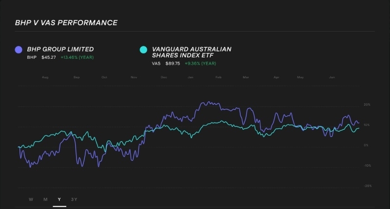 $BHP and $VAS 1-year performance compared in our Stock Comparison Tool